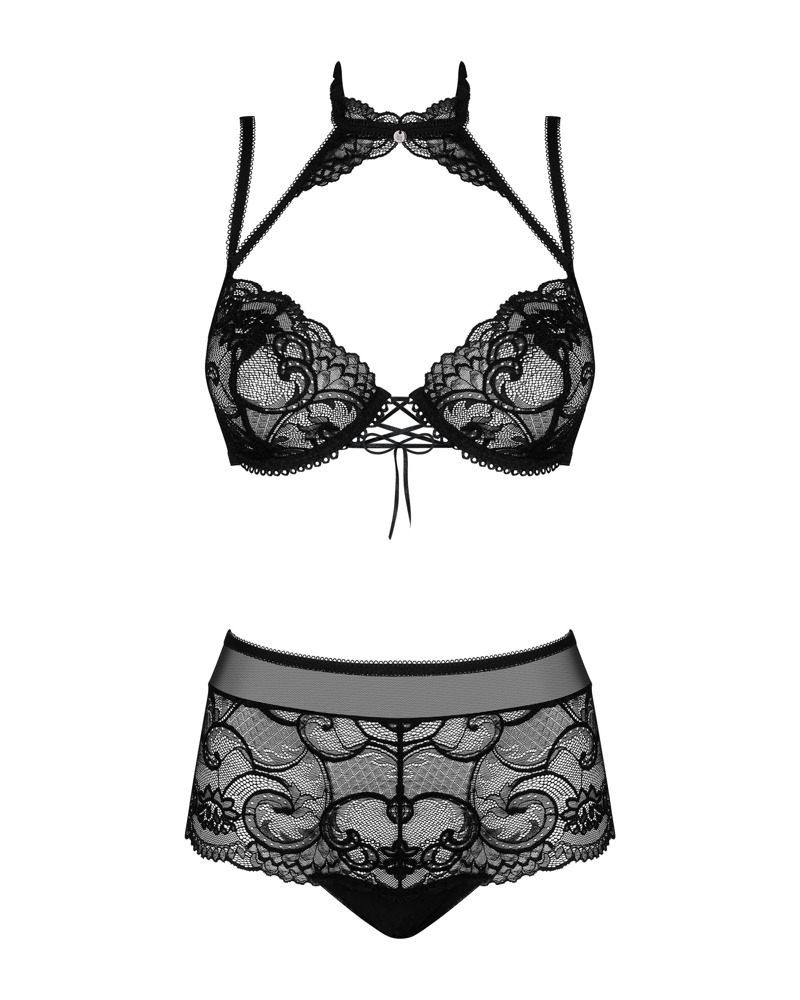 Fall for the black lace and fancy design of the Elizenes set. Thanks to the gorgeous bra we prepared for you, your lover will be whispering seductive confessions all night long. The lace choker will add chic, and the super sexy corset binding between your breasts will heat up his fantasies. The whole is topped with see-through lace with a sensual pattern.