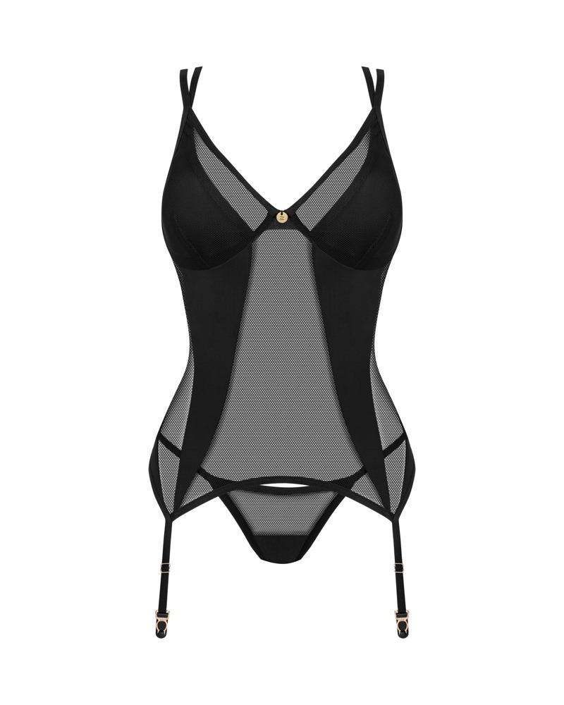 Suspender top and thong in the black Nesari set by Obsessive. Soft elasticated mesh in a stylish mix with opaque stretch material. Small jewellery element between the underwired cups. With an adjustable hook fastener at the low back. The sophisticated crossed double straps and suspender straps can also be adjusted to fit. The mesh thong is opaque at the crotch.