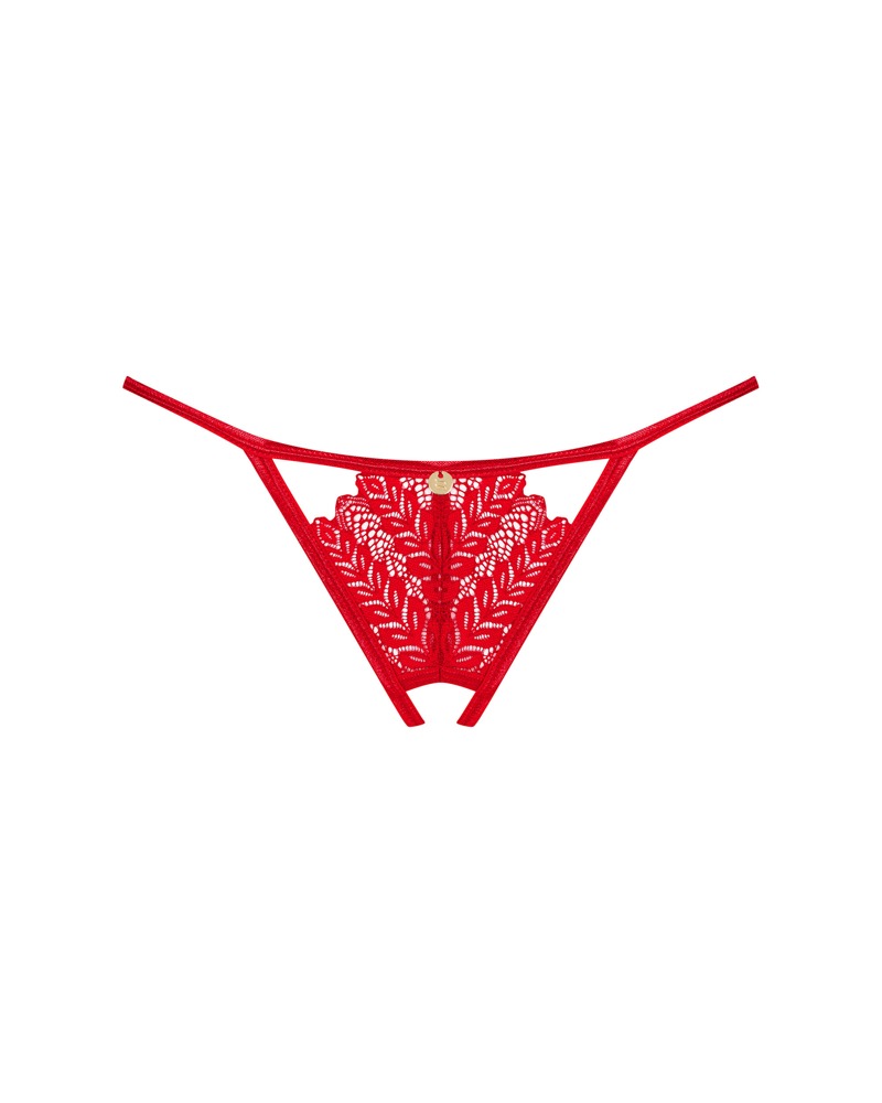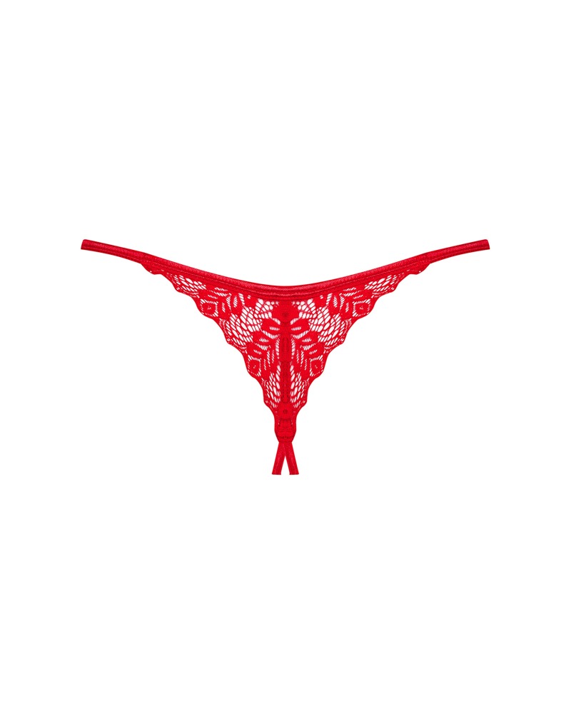 Beautiful crotchless thong Ingridia by Obsessive made of delicate red lace. Soft and stretchy for a high level of comfort. With small cut-outs and a small jewellery element at the front on the narrow stretch waistband. Invitingly open at the crotch.