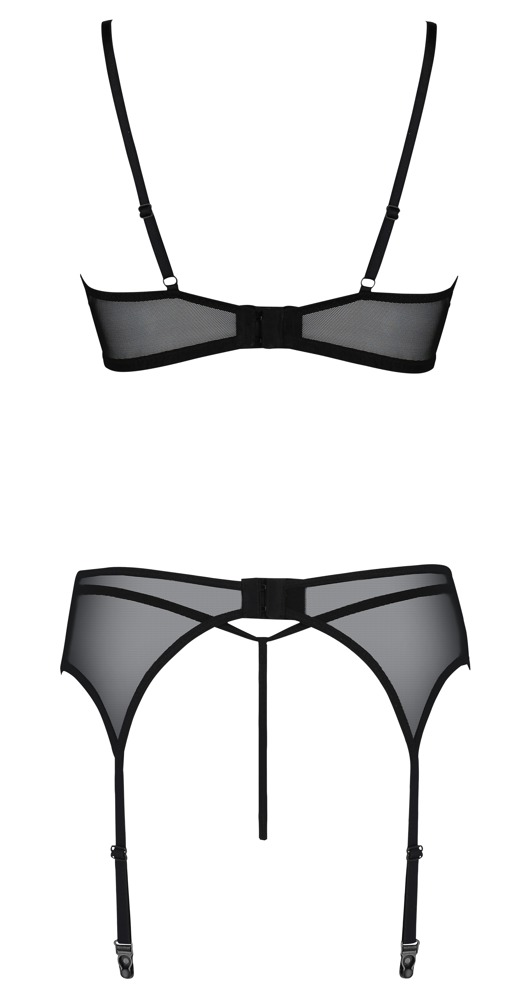 An underwired bra, suspender belt and string in the Primula Set from the Eco Collection from Passion. All three pieces are made out of stretchy and transparent powernet. The suspender belt has delicate burnout lace and two cut-outs at the front just like the bra's underwired cups. The bra and suspender belt has a hook fastener at the back. The bra and suspender straps can be adjusted for a perfect fit.