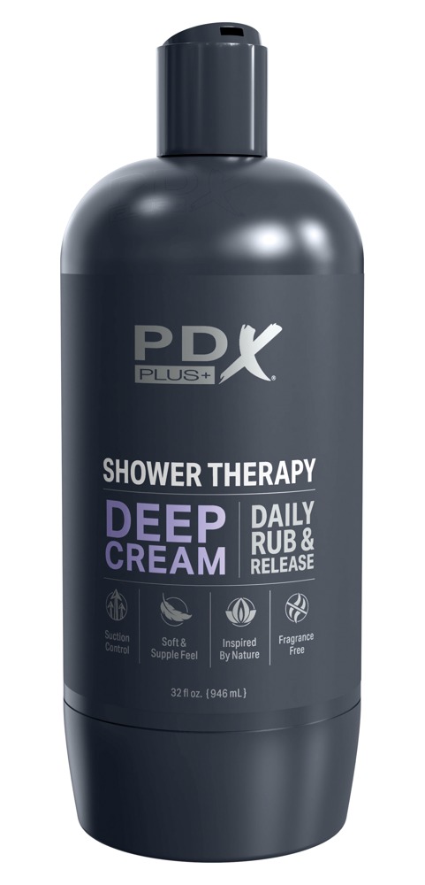 The masturbator Shower Therapy Deep Cream from PDX Plug looks from the outside like a normal shampoo bottle. But beneath the bottom cap hides a tight pleasure canal with an exciting texture for an intense penis massage during a handjob. The closure of the bottle doubles as a suction control mechanism that can control the blowjob sensations by opening and closing it.