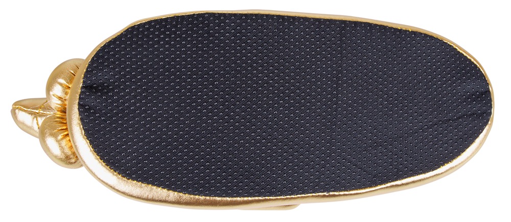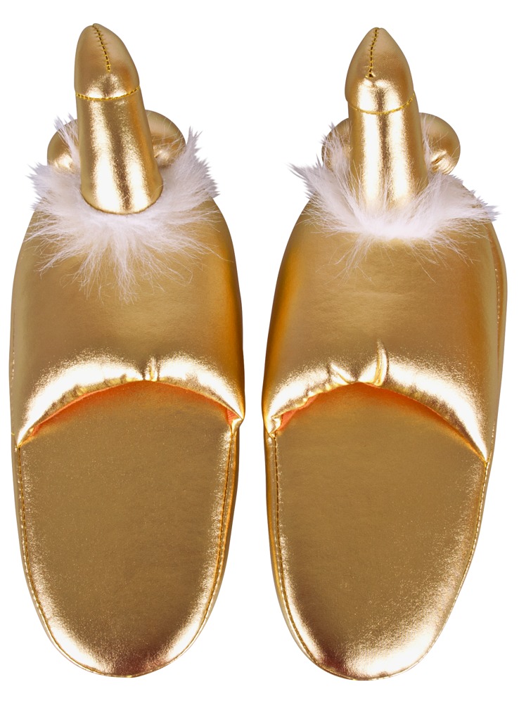 Gold-coloured slippers made of soft material with a penis and testicles at the tip of each slipper. Standard size: approx. 37 to 43. Material: cover 100% polyester, lining 100% polypropylene.