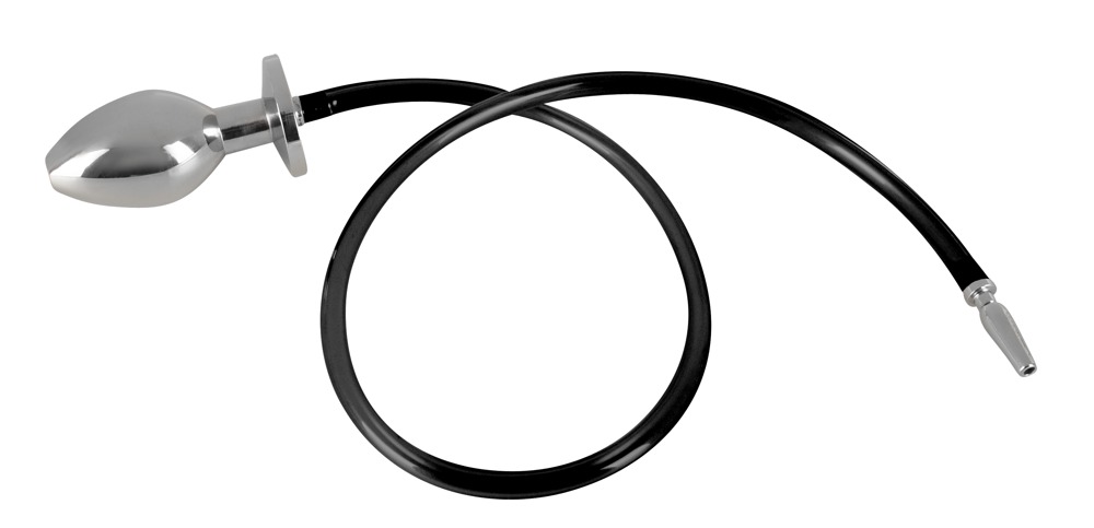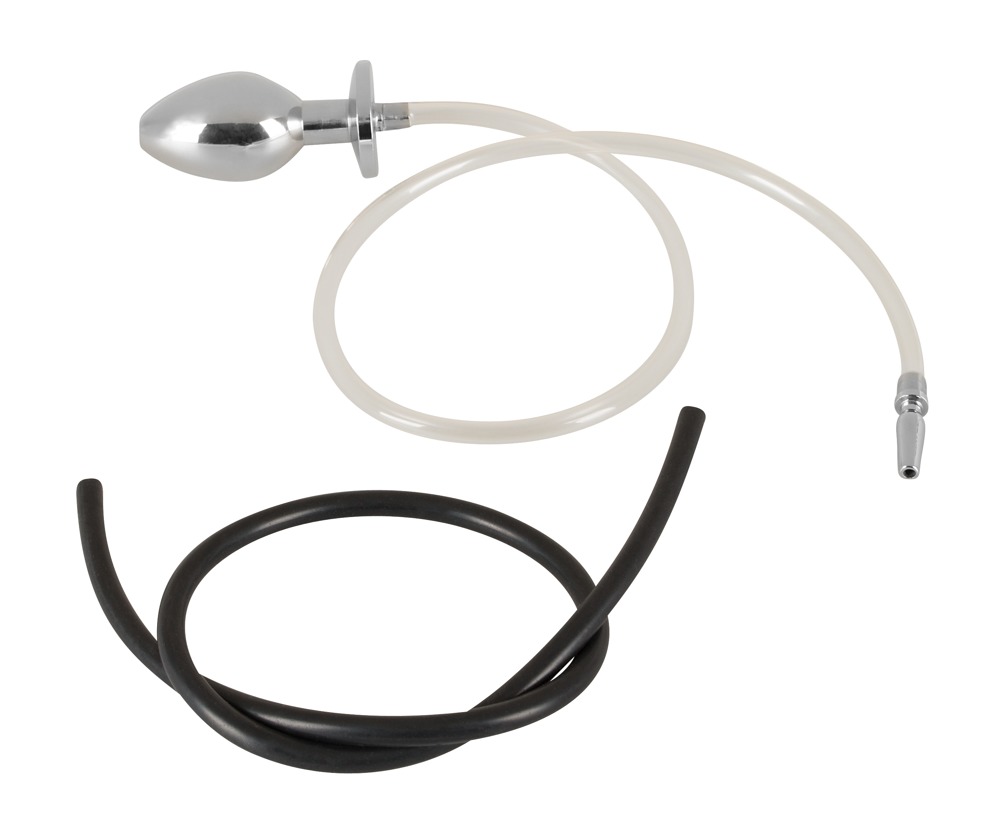 The hollow, heavy butt plug is connected to the open penis plug with a tube. Includes a black replacement tube.