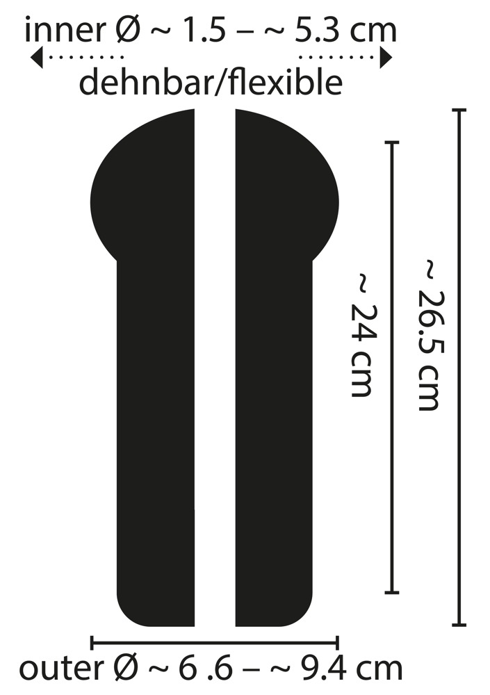 Complete length 26.2 cm, insertion length 24 cm, inner Ø 1.5 cm (flexible up to max. 5.3 cm), outer Ø 6.6 cm to 8.8 cm. 689 g. TPE, ABS.