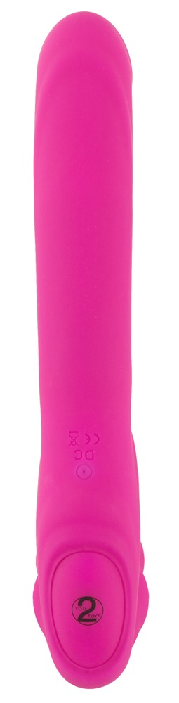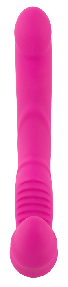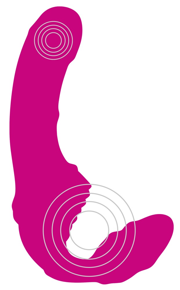 Strapless strap-on with a flexible double vibrator. The short, pronounced, wavy vibrator gets inserted into the vagina and then held by the vaginal muscles. Now the partner can be pleasured by the longer vibrator with a stimulating texture. The 9 different vibration modes can be adjusted with the button on the remote control (range 5 m). The double vibrator is covered in a soft touch texture which feels great against the skin during play and wear. Rechargeable - includes a USB cable and a battery (CR2032) for the remote control.