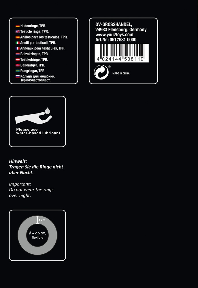 The 3-piece ball ring set, Ball Stretching Kit from You2Toys, is perfect as a training kit for stretching the balls. The 1 cm ring should be used first for the stretching. Then the 2 cm ring can be used when the balls have been trained a bit. The widest ring (3 cm) should be used last – this ring will stretch the balls the most. The rings can also be used together or separately.
