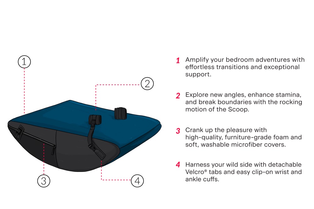 The ergonomically designed rocking cushion can also be used upside down as a sex position ramp. Scoop Rocker also invites you to enjoy comfortable soft bondage sex. Scoop Rocker comes with a blindfold, 4 bondage cuffs and 4 bondage connections. The hook-and-loop fasteners can be easily positioned on the cushion as desired. The D-rings and strap fasteners can then be used to quickly attach the supplied ankle cuffs or your own equipment. The included, softly padded ankle cuffs for hands and feet can be adjusted with hook-and-loop fasteners.