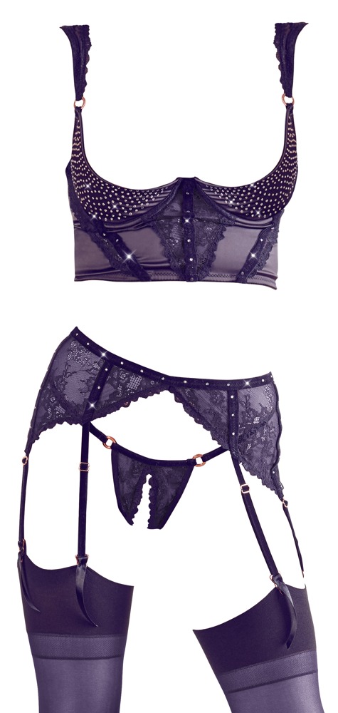 A beautiful 3-piece set made out of lace and velvet. The shelf bra has slightly padded, underwired cups and is decorated with rhinestones and velvet straps. The lace inserts at the front and on the straps add the elegant finish to this outfit. The crotchless string and the suspender belt with 6 suspender straps are made almost completely out of lace but they also have decorative velvet straps. The suspender strap clips are hidden by a beautiful satin ribbon. The bustier has a long hook fastener while the suspender belt is fastened with a clip.