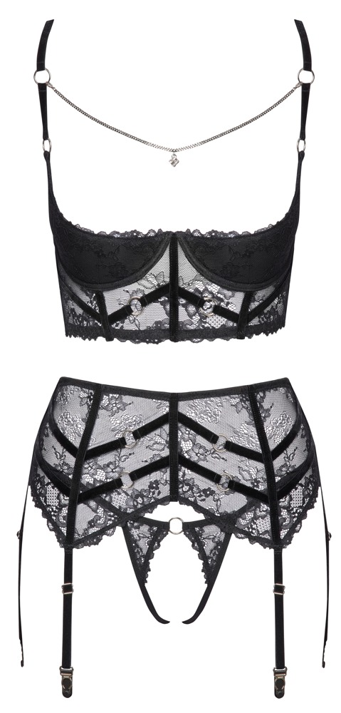 A longline bra, suspender belt and crotchless string are combined to make an elegant & erotic set from Cottelli LINGERIE. Everything is made out of soft, delicate, stretchy black lace. It also has velvet straps and silver-coloured ring decoration. The longer cut shelf bra has underwired cups that are slightly padded. There is also a removable rhinestone chain in the otherwise open cleavage area. The hook fastener at the back and the velvet straps are adjustable. The wide suspender belt also has an adjustable hook fastener at the back too. The 6 velvet suspender straps are adjustable as well. The small string is seductively crotchless.