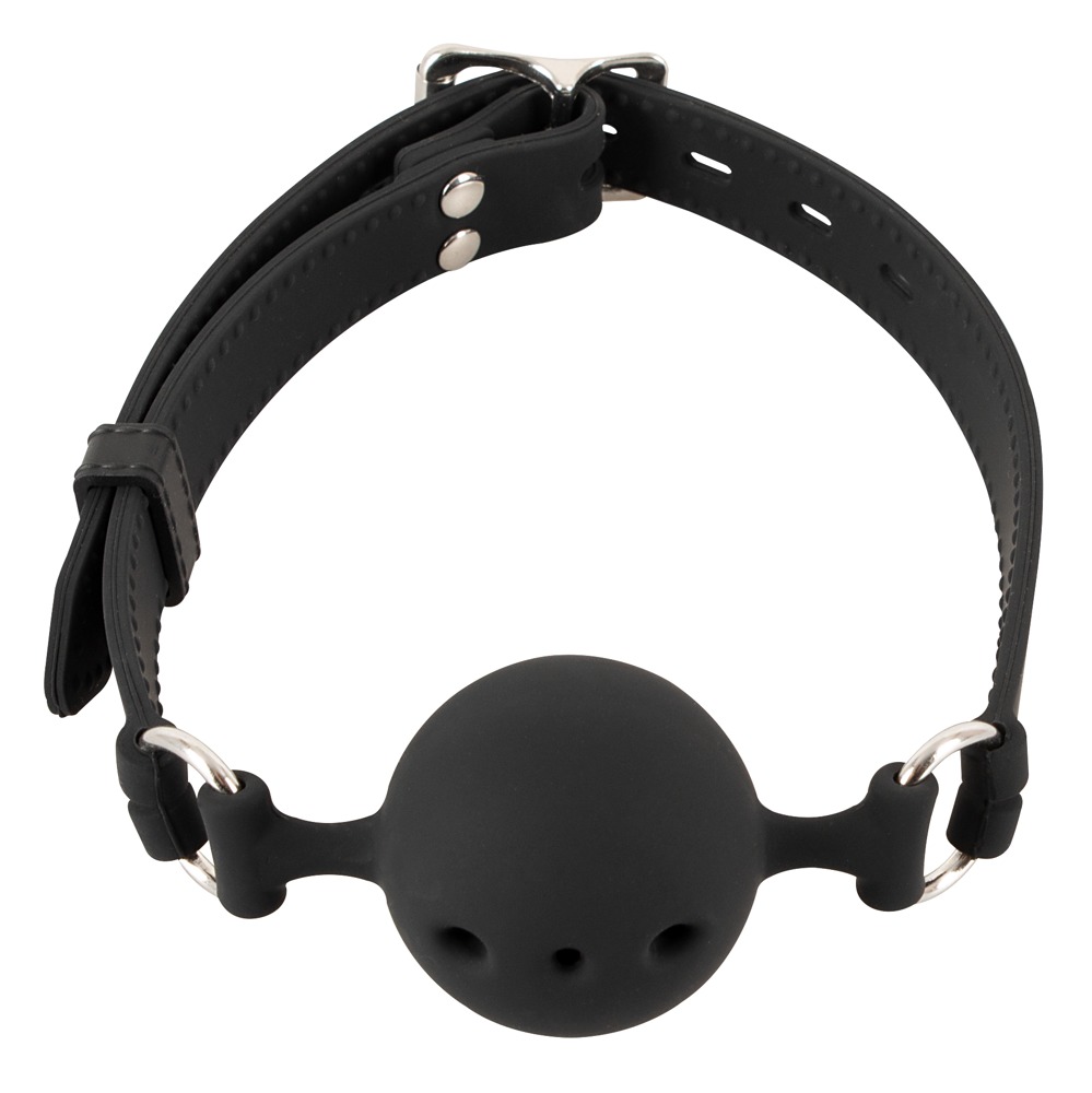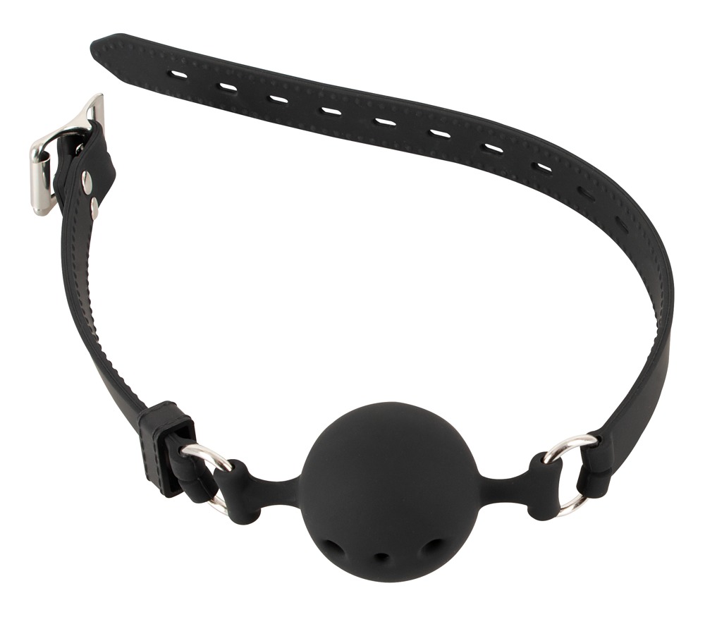 Black gag with breathing holes and adjustable strap. Ø of gag 4 cm. Material: silicone.