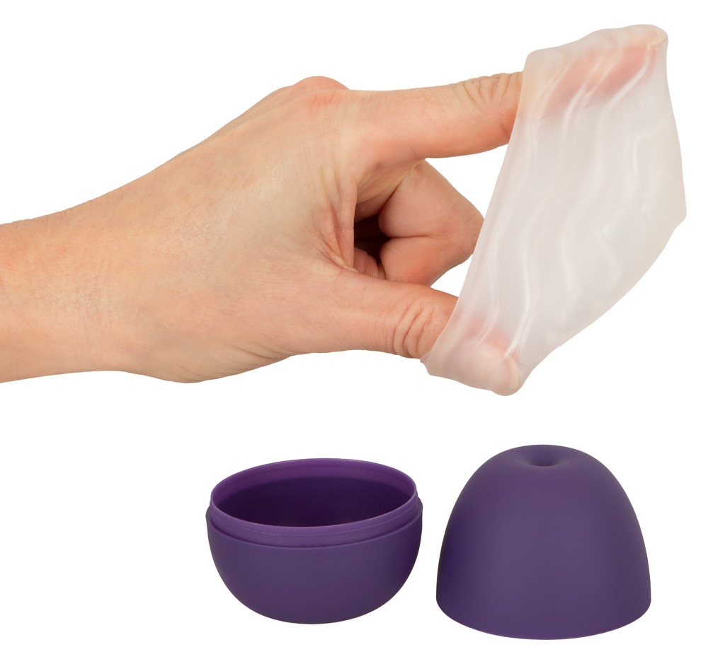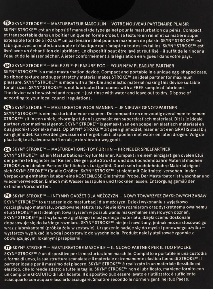 Compact, reusable masturbator Stroke from Skyn for an intense penis massage during a handjob – alone or with a partner. The ultra flexible masturbator sleeve comes in a discreet egg-shaped box and with lubricant. Simply use water and soap to clean the masturbator after use.