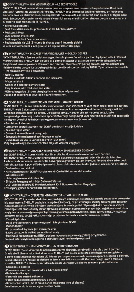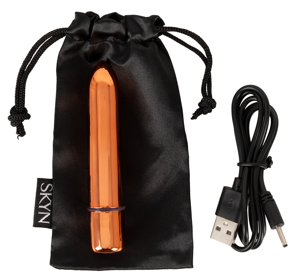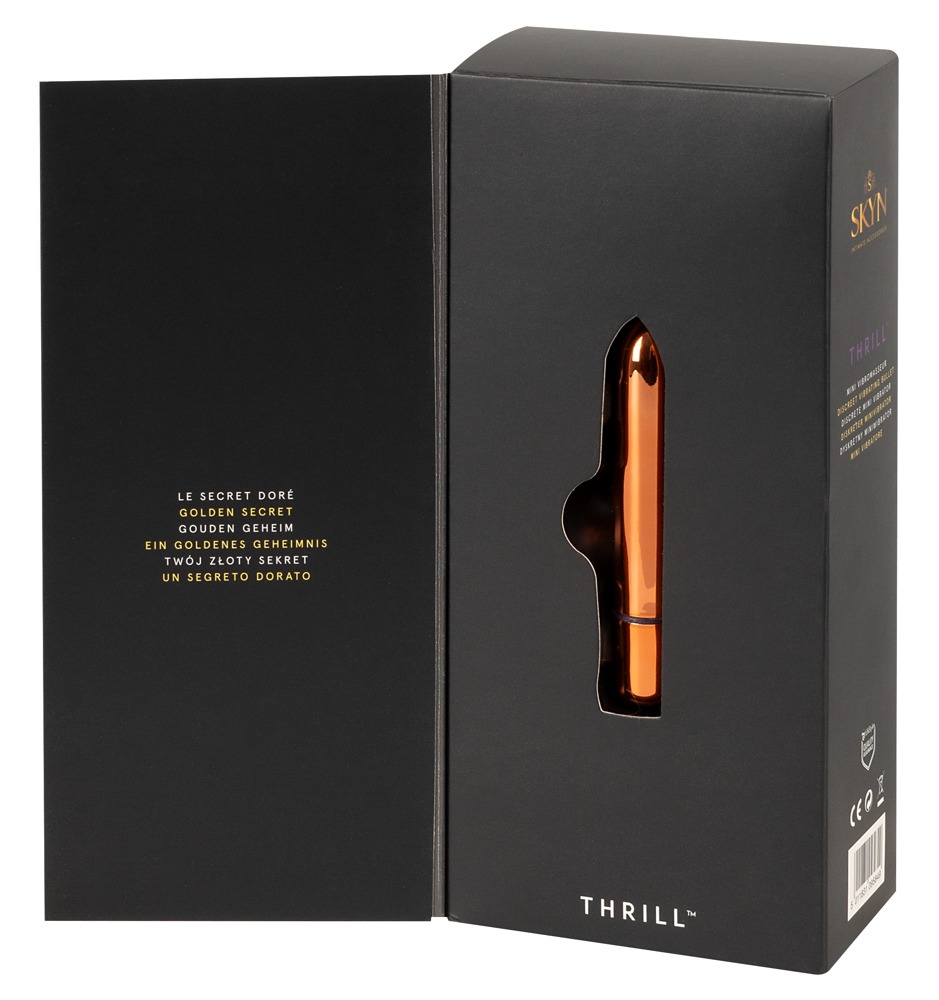 The bullet vibrator Thrill by Skyn in an elegant rose gold-coloured design. A discreet, luxurious stimulator that can be taken anywhere. Even in the bathroom and shower, as it is waterproof. The quiet, yet powerful vibrations can be conveniently controlled in 3 levels directly on the toy at the touch of a button.
