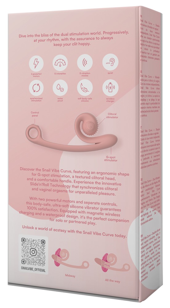 Innovative Snail Vibe Curve dual vibrator for simultaneous stimulation of the vagina, G-spot and clitoris allowing for the experience of multiple orgasms. Its ingenious design with the rolling, flexible clitoral stimulator also ensures permanent clitoral stimulation during every vaginal penetration, no matter how deep the vibrator is inserted. The vibrations can be felt constantly both outside and inside simultaneously! With its new ideal curved shape, the Snail Vibe Curve now also reliably reaches the G-spot for even more sensation-intensive dual stimulation.