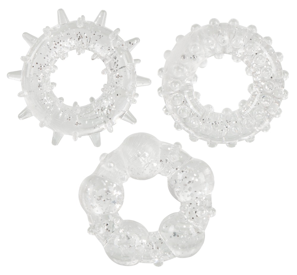 Three stretchy cock rings made of soft stretch material in excitingly shimmering glitter-look. Keep HIM in top form through blood flow restriction and stimulate HER with the different stimulus textures! Can be worn individually or in combination. Each Ø 1.5 cm (elastic).