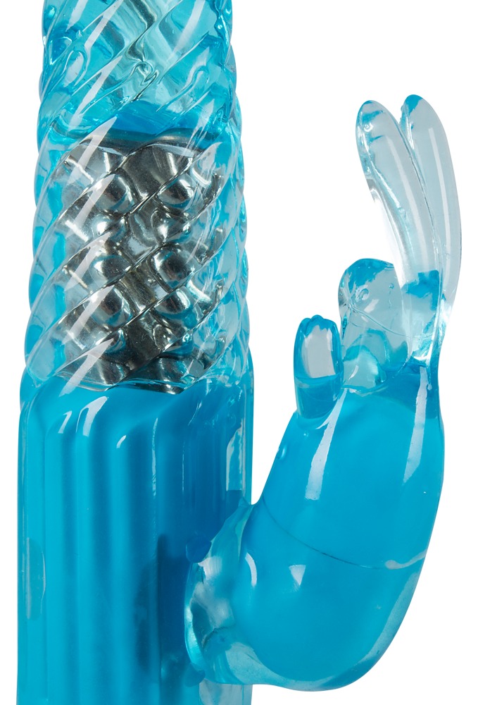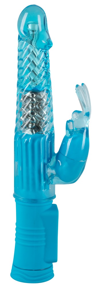 Pearl vibrator with a rotating shaft and rabbit-shaped clitoral stimulator with flexible ears. 4 rotation levels and 8 vibration levels that can be controlled separately at the push of a button. Complete length approx. 22 cm, diameter: approx. 2.6 - 3.2 cm. Material: TPE, ABS. (Please order batteries separately: 4 x Micro)