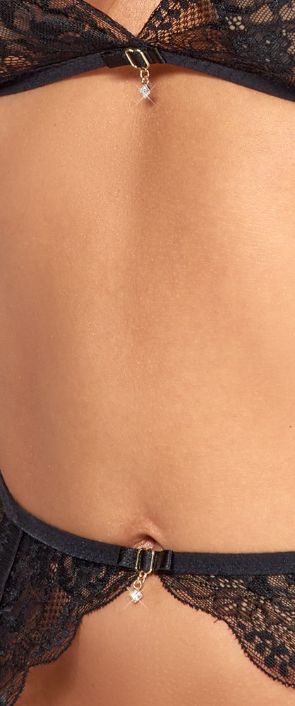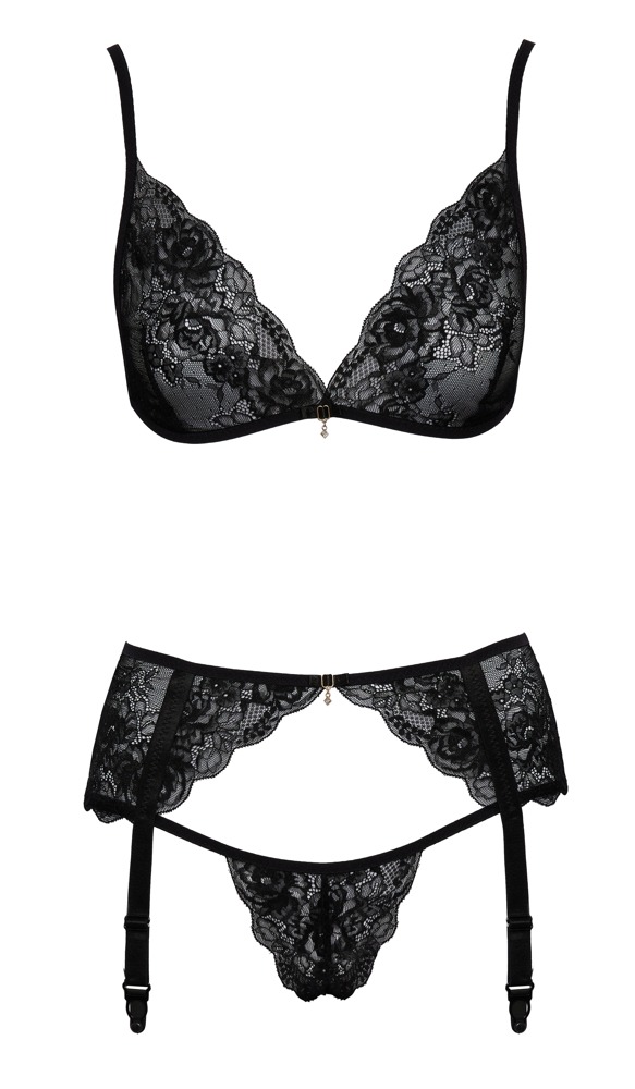 Soft bra, suspender belt & thong in a set from kissable completely made of fine black lace with gold-coloured details. Soft and stretchy for maximum comfort. The bra and suspender belt are decorated with bows and glittering stones at the front, and each has a hook fastening at the back. The straps and wide suspenders are adjustable to fit. The small lace thong seduces with two narrow stretch straps that join at the crotch.