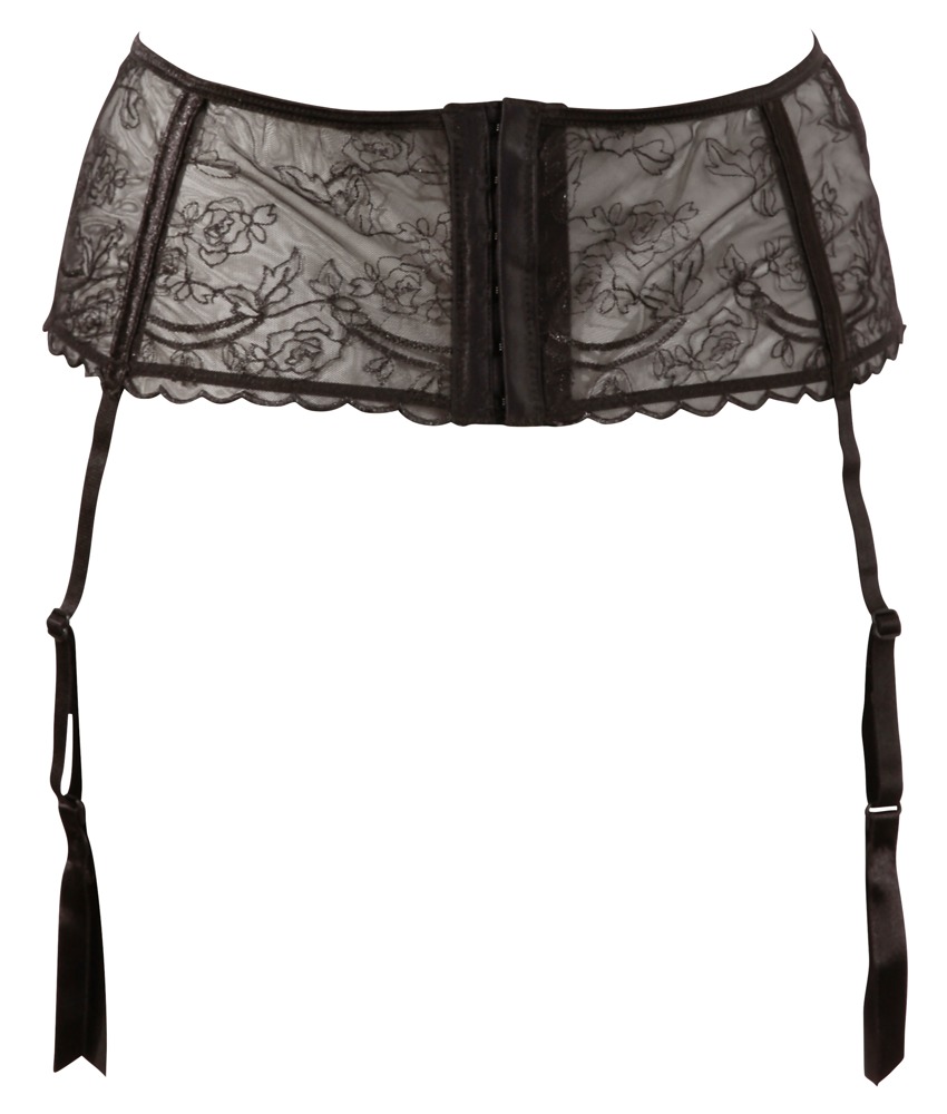 Suspender belt with four adjustable straps and a hook fastener with two rows of hooks. Transparent black material with delicate embroidery.