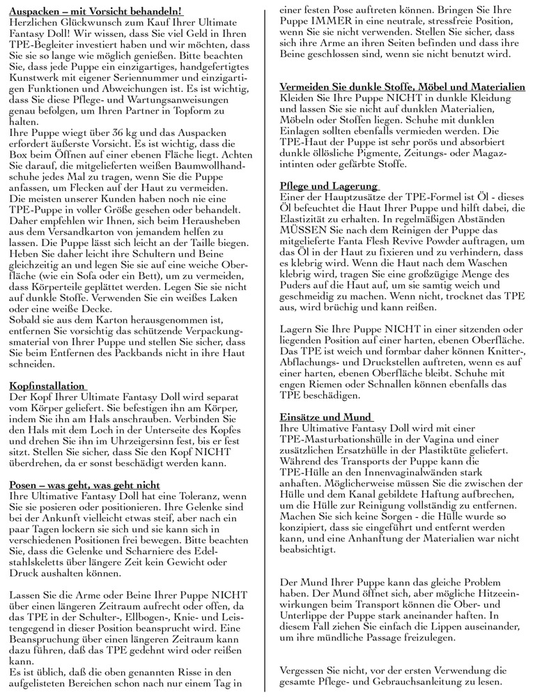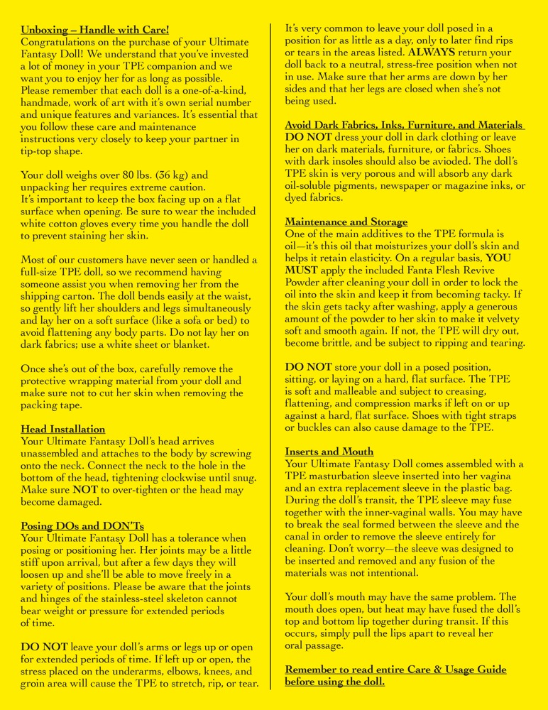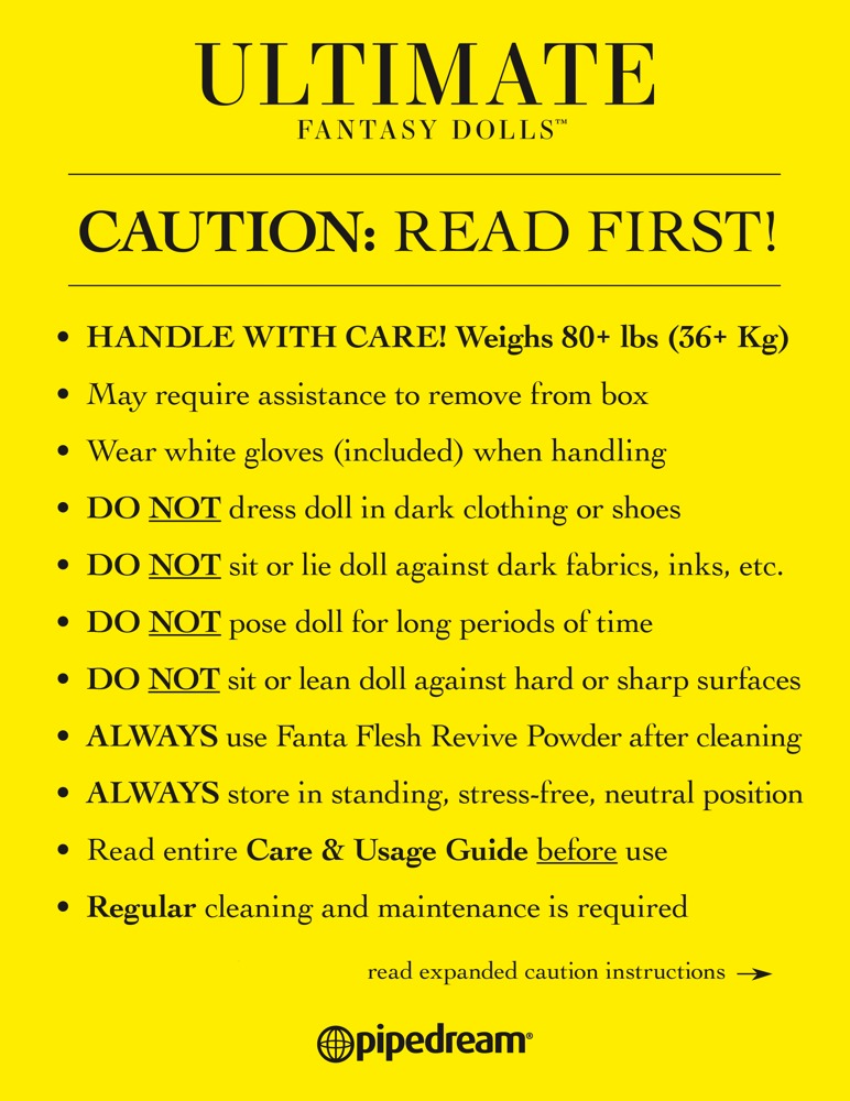 This full-size love doll can hardly be distinguished from a real woman! Carmen has an extremely beautiful 3D face with deep brown eyes, long lashes and luscious lips. Her skin is made out of high-quality Fanta Flesh material and feels incredibly realistic. Her vaginal, anal and oral openings are very authentic. Same goes for her sensuous labia. The long-haired brunette has a slender silhouette with wide hips and voluptuous breasts with perfectly shaped nipples. Her detailed hands and feet know to impress and also have manicured nails. Her entire body is movable thanks to a stainless steel skeleton inside. Bolts at the bottom of her feet make it possible that the doll can stand on her own. Includes a great variety of accessories: