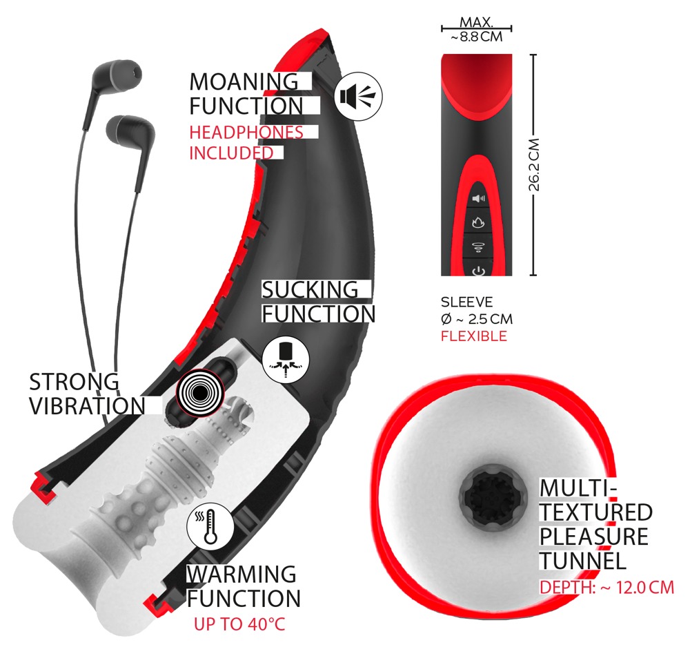 Powerful Masturbator 03 from WYNE that provides an intense, fully-automatic stimulation of the penis with 7 vibration modes and 3 suction modes. The warming function up to 40°C and the light and sexy moans (3 sounds) via the included headphones will arouse the person using the masturbator even more. All functions can be controlled easily and separately with the buttons on the easy-to-use sex toy.