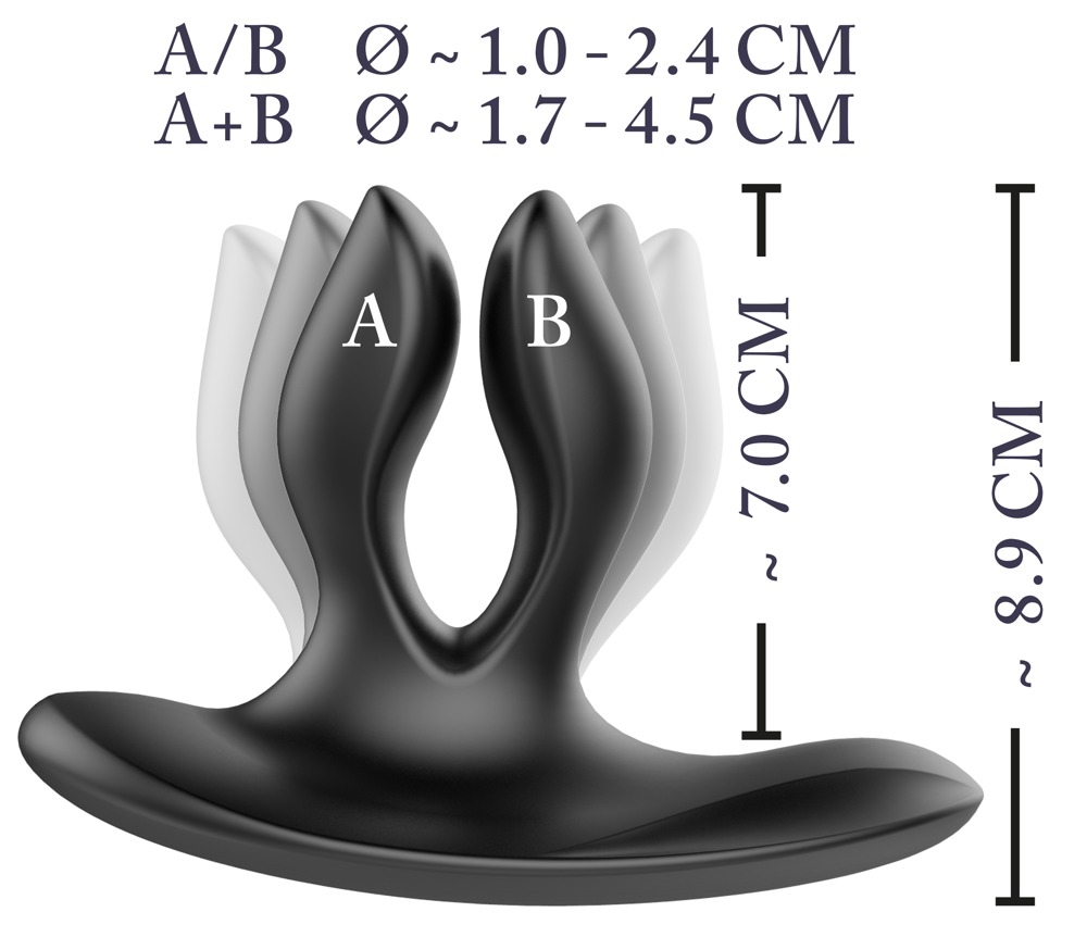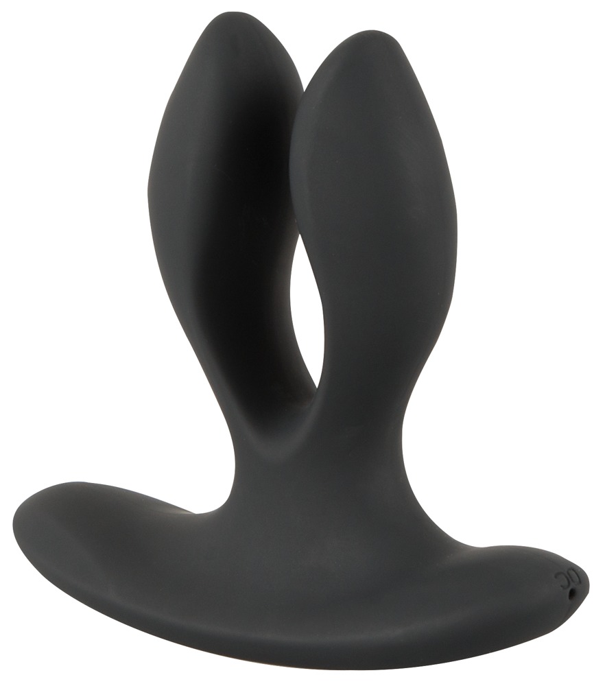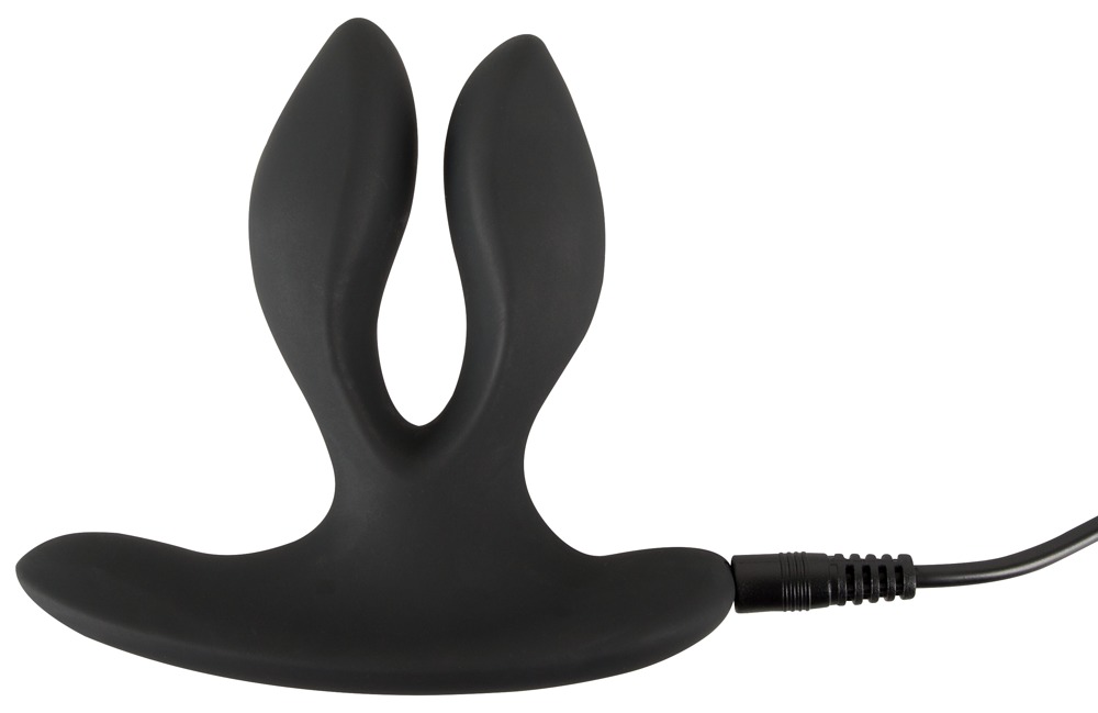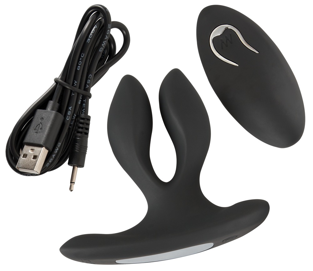 Fancy vibro-butt plug with two arms and a stimulating perineum bar. The flexible arms are pressed together before being inserted. Once the plug has been inserted into the anus, the arms spread out again. The 2 powerful motors (one in each arm) provide diverse pleasure with their vibration modes. There are 12 vibration modes per motor and they can easily be controlled via the remote control – a partner can also use it as well! The plug remembers the last vibration mode that was used before it was turned off, thanks to its clever memory function, and it starts on this vibration mode when it is turned on again. This Vibrating Expander Butt Plug is waterproof which means that it can also be used in the bath or the shower. The two-armed plug is covered in soft silicone which feels great against the skin and when it’s being worn. It can be recharged with the included USB cable. Includes a high-quality storage bag. Please order the battery for the remote control separately: 1 x AAA.
